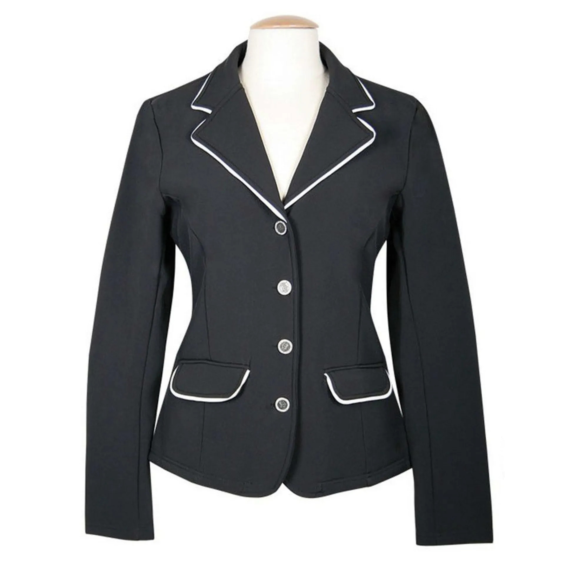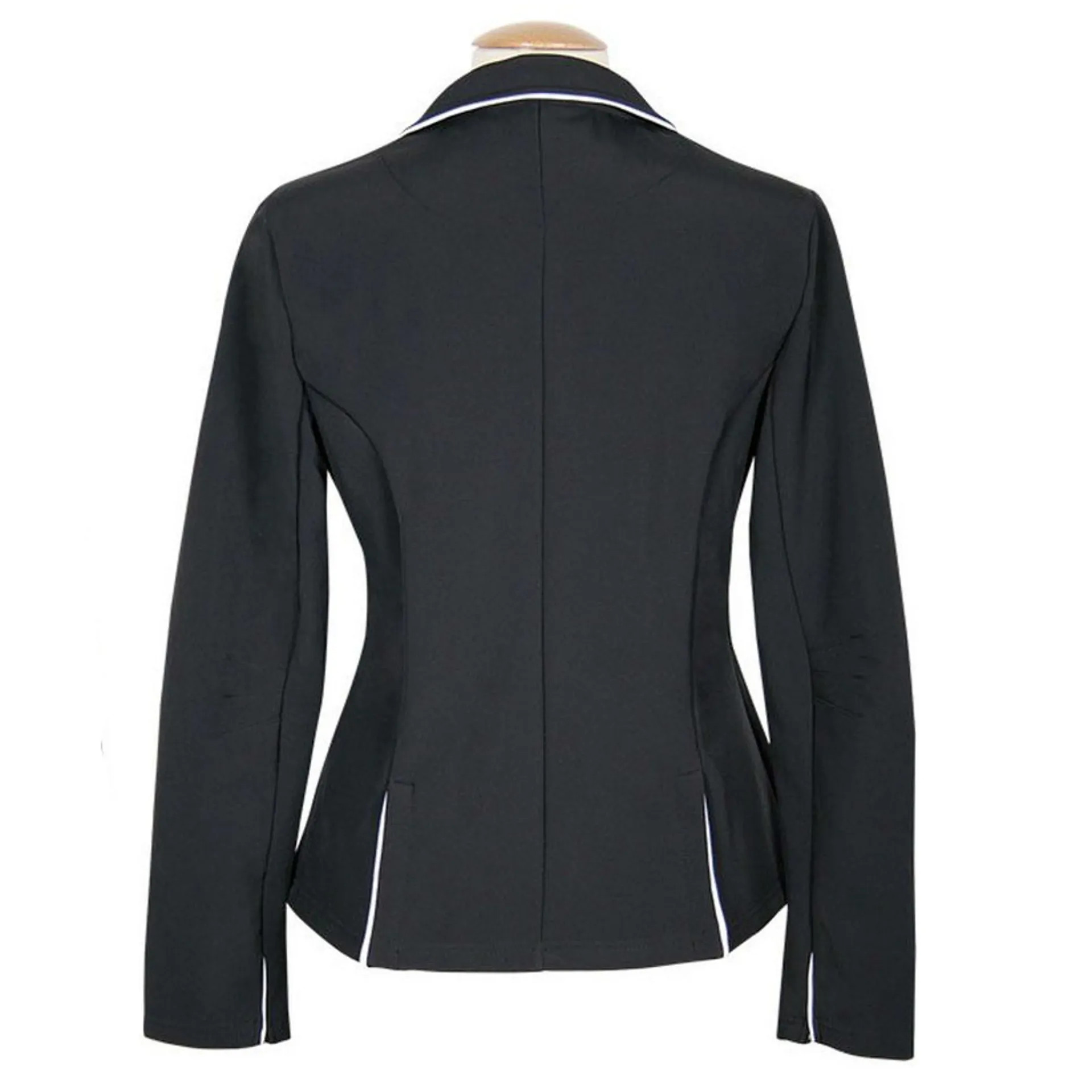 Sporttinen musta kilpailutakki korkealaatuisesta, vettähylkivästä ja tuulenpitävästä softshell-kankaasta. Istuva malli, kaksi etutaskua, valkoinen kontrastitere, kaksi takahalkiota. 100 % polyesterisoftshell-materiaalia. Kapealinjainen istuvuus.