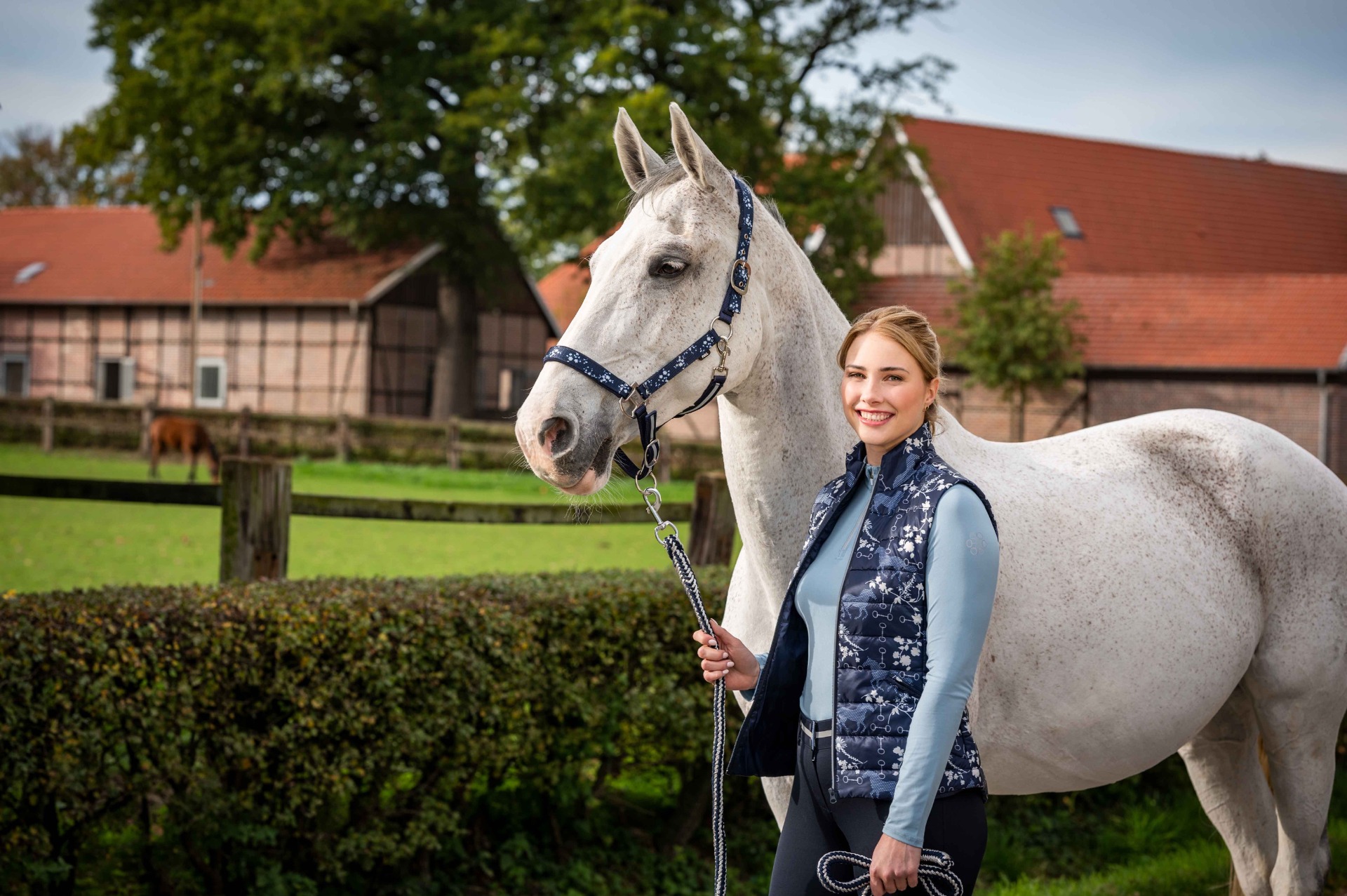 Hevoskuvioitu, kapealinjainen kevyttoppaliivi, jossa sivutaskut vetoketjulla, sekä edessä 2-suuntainen vetoketju heijastimella.