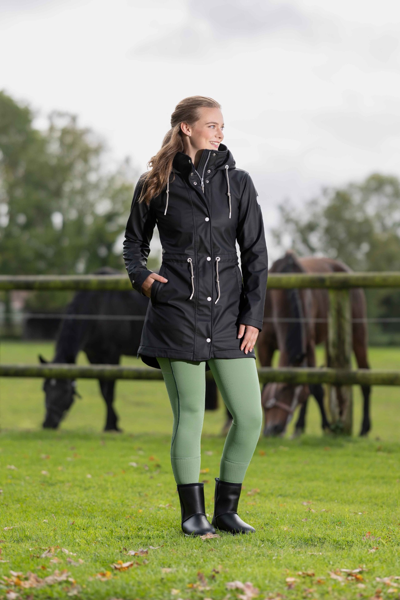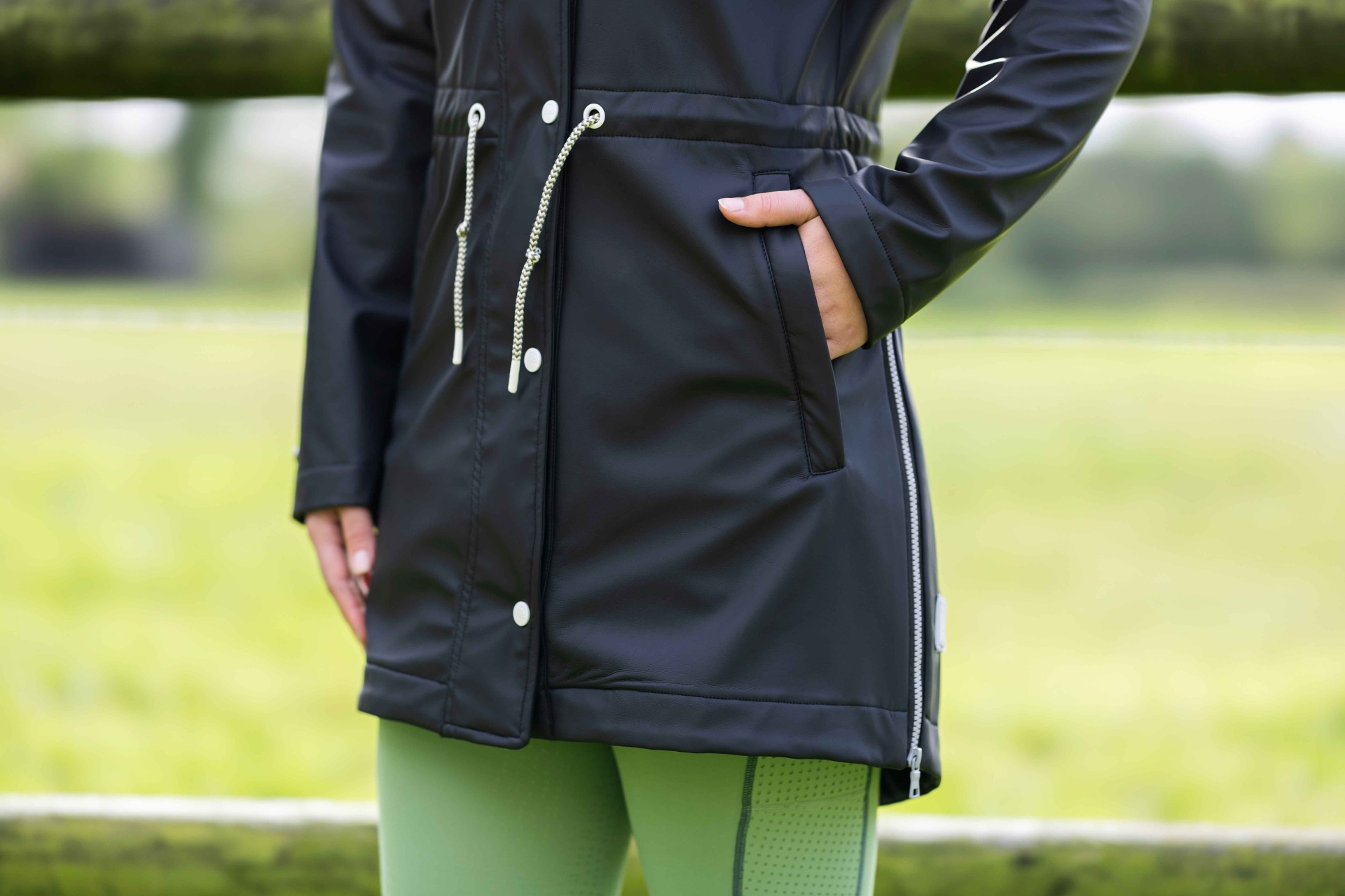 • Veden-ja tuulenpitävä puolipitkä takki fleecevuorella. Takki sopii erinomaisesti esimerkiksi ratsastukseen, ulkoiluun tai tallitöihin. Kangas on hengittävä sekä likaa hylkivä. Pehmeän fleecevuoren ansiosta se lämmittää mukavasti kosteilla syys- ja kevätkeleillä. Kaksisuuntainen vetoketju nappilistalla sekä vedenpitävät vetoketjutaskut tarjoavat lisämukavuutta ja toimivuutta. Takissa on monia käytännöllisiä yksityiskohtia kuten säädettävä vyötärönauha, nauhoilla kiristettävä huppu sekä vetoketjulliset sivuhalkiot ratsastukseen. Hupun voi kiinnittää takin selkäosaan painonapilla. Kuminen ulkopinta. Takin kainaloissa on kaksi tuuletusreikää. Helmassa ja hihassa HKM logomerkki. Täydellinen takki sadesäille!
