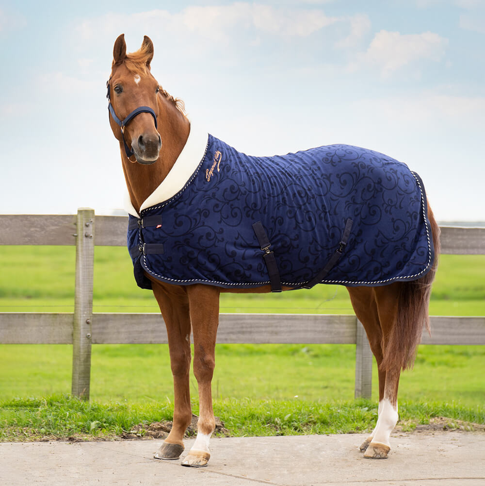 Upea, teddykarva kauluksella oleva fleeceloimi jossa kaunis kuviointi ja ruusukullan väriset yksityiskohdat. Loimi sopii mm. edustusloimeksi kuljetus-, kisa-, tai näyttelymatkoille.