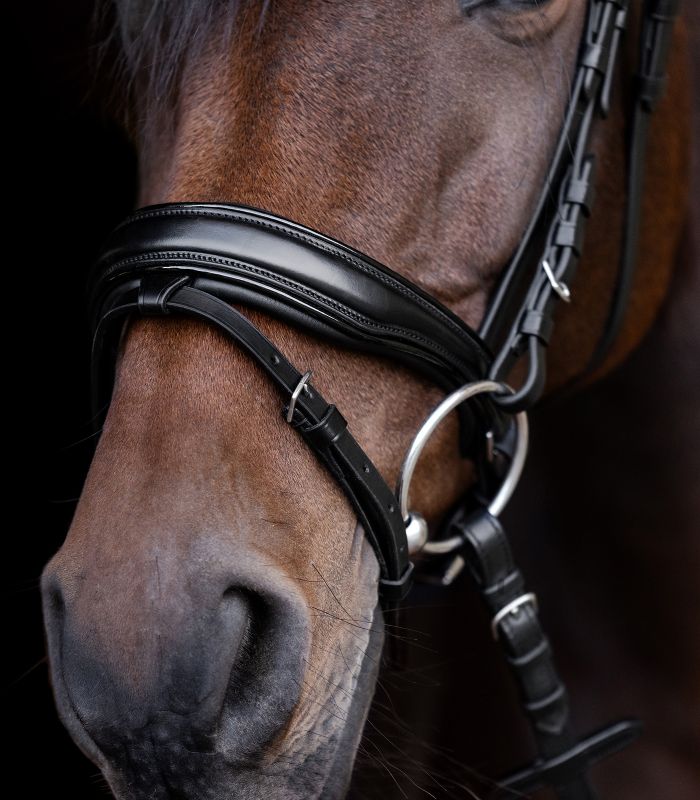 Tyylikkäät, anatomisella niskahihnalla olevat mustat suitset, joissa leveä, reunoille kapenava turpahihna, ja tyylikäs otsapanta, jossa kauniit mustat koristekivet. Sis. myös ohjat
