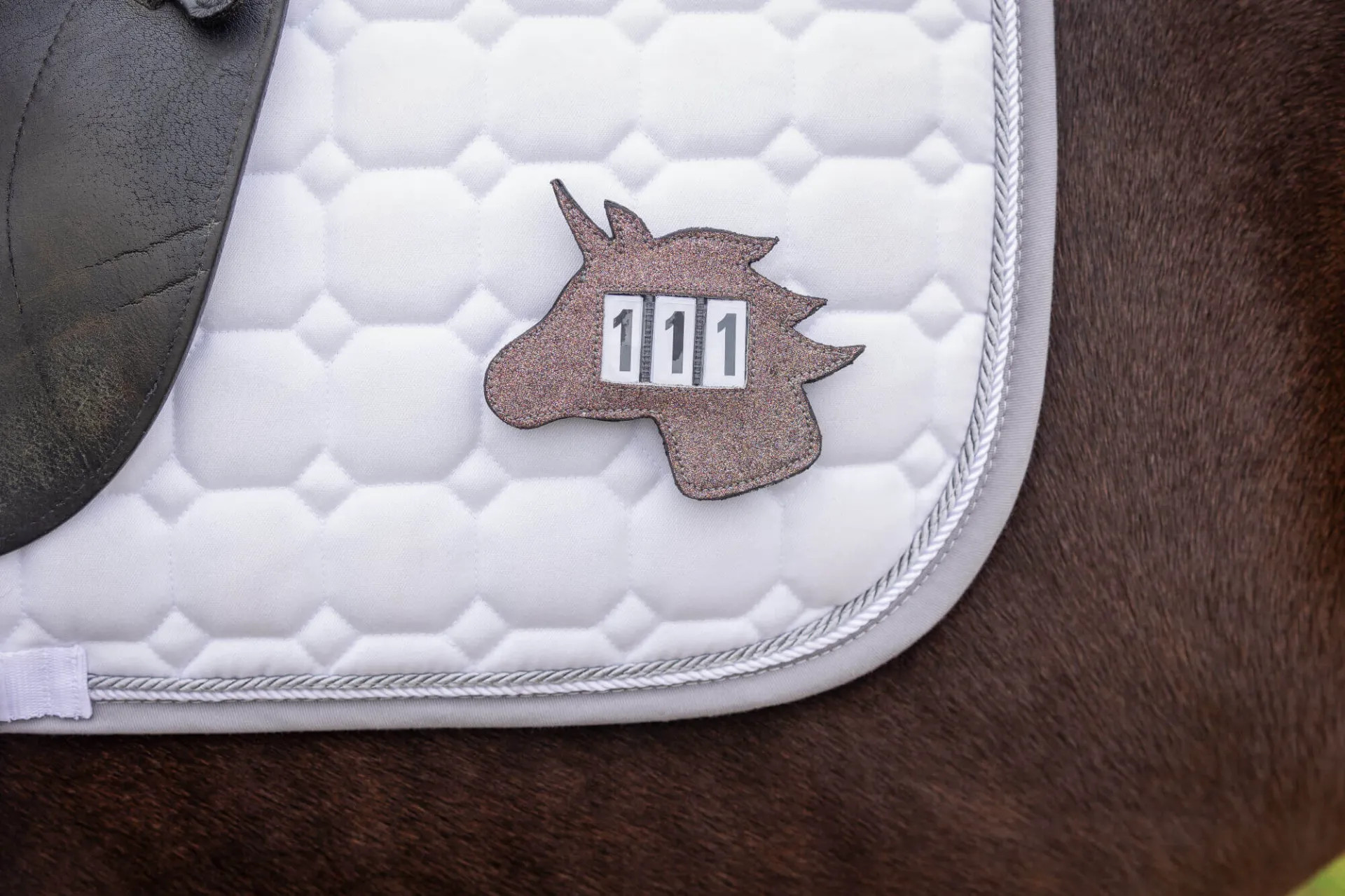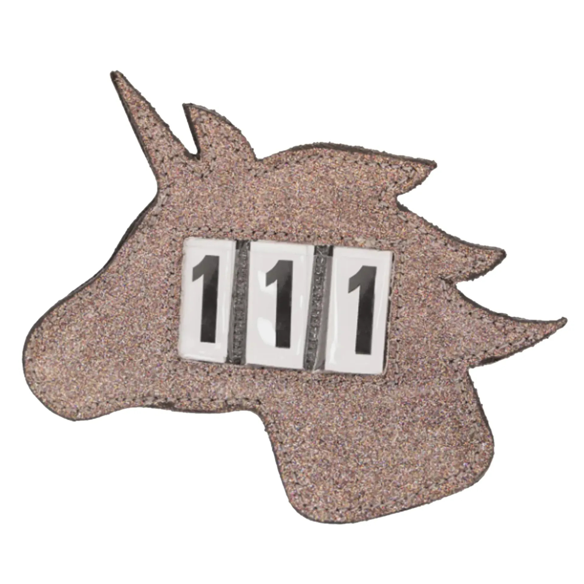 Ihana yksisarvisen muotoinen kisanumero, joka kimaltelee sateenkaaren väreissä.