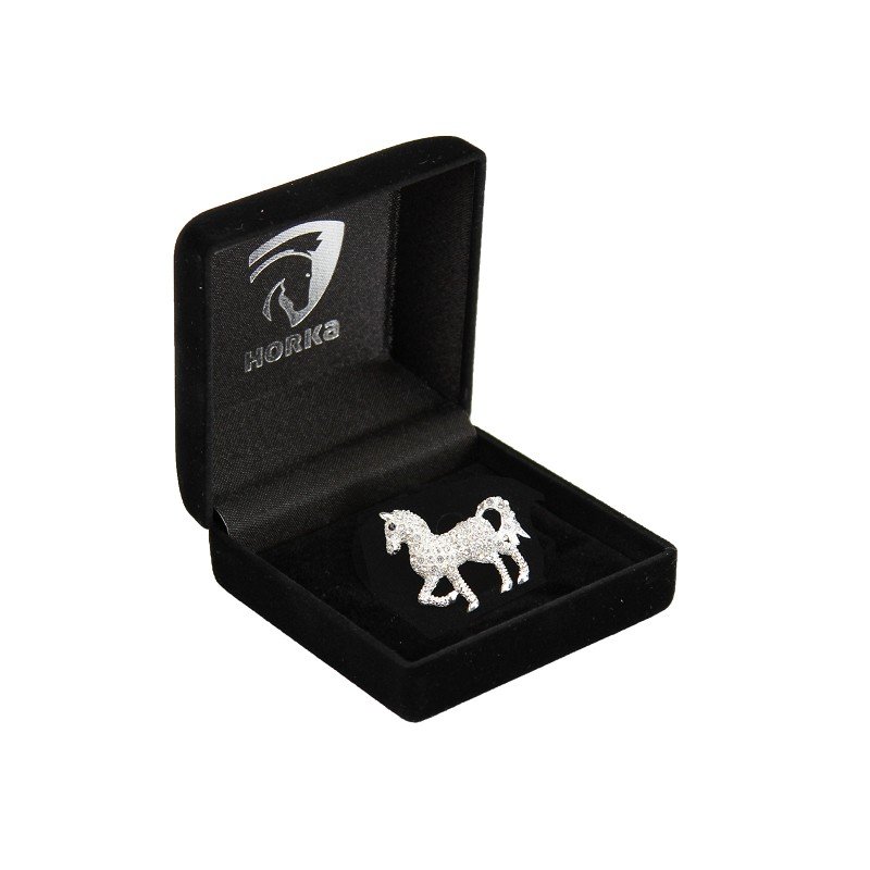 Hopeanvärinen strasseilla koristeltu hevonen, toimitetaan lahjarasiassa.