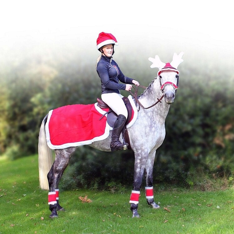 Punainen tonttulakki, jota voi käyttää  kypärän päällä. Valkoinen reunus ja valkoinen tupsu.