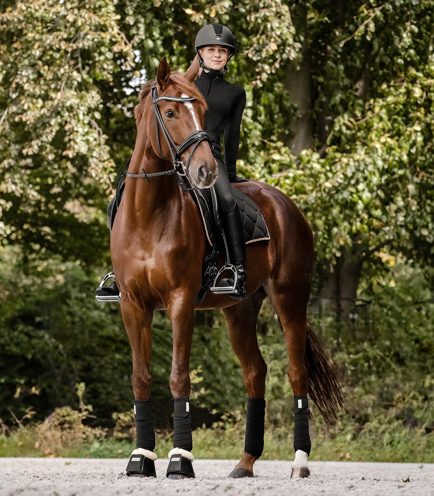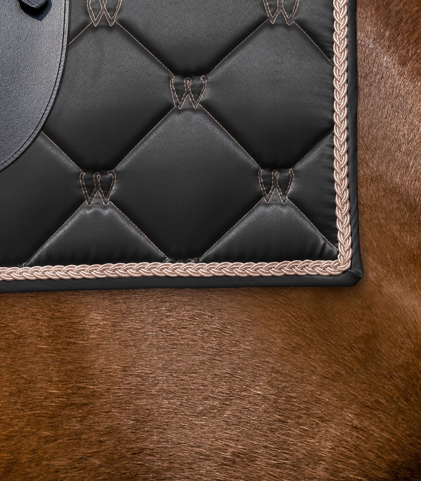 Elegantti ja laadukas satulahuopa satiininhohtoisella pinnalla. Tekninen alapinta siirtää tehokkaasti kosteutta. 10 mm vaahto and 200 g/ m² täyte takaavat hyvän iskunvaimennuksen. Tyylikäs musta väri ja ruusukullan väriset koristenauhat reunoissa. Edessä sään vieressä paksumpi toppaus, joka pitää huovan hyvin paikoillaan satulan alla.