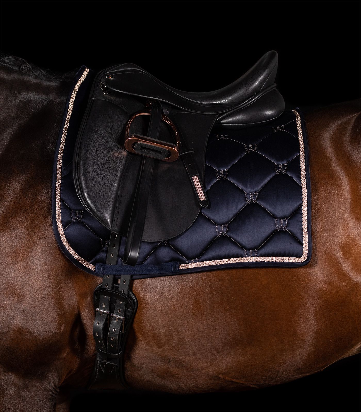 Elegantti ja laadukas satulahuopa satiininhohtoisella pinnalla. Tekninen alapinta siirtää tehokkaasti kosteutta. 10 mm vaahto and 200 g/ m² täyte takaavat hyvän iskunvaimennuksen. Tyylikäs musta väri ja ruusukullan väriset koristenauhat reunoissa. Edessä sään vieressä paksumpi toppaus, joka pitää huovan hyvin paikoillaan satulan alla.