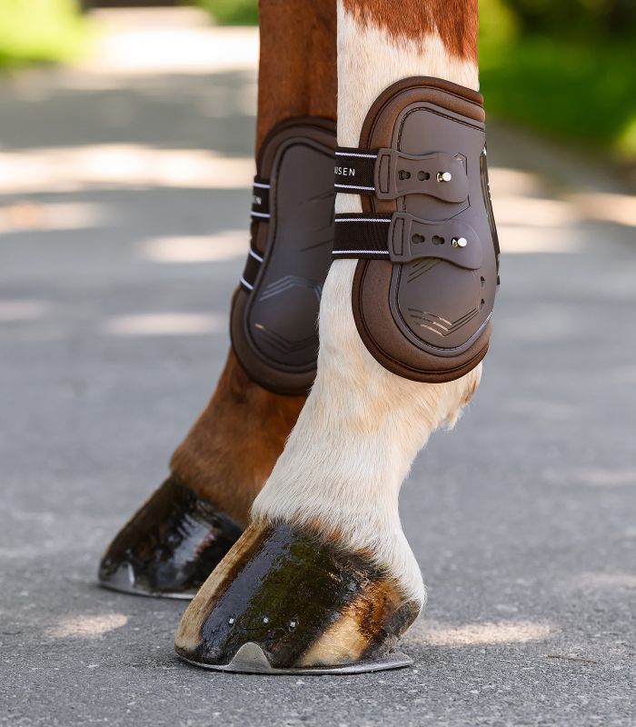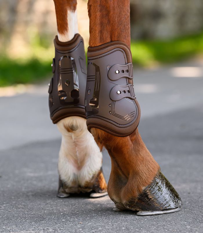 Takajalkojen jännesuojat. Anatomisesti muotoiltu ulkokuori ilmarei'illä. Iskuja vaimentava pehmuste muistivaahtotäytteellä. 3-suuntaisesti säädettävä, käytännöllinen pikalukitusnappikiinnitys joustolla optimaaliseen säätöön.