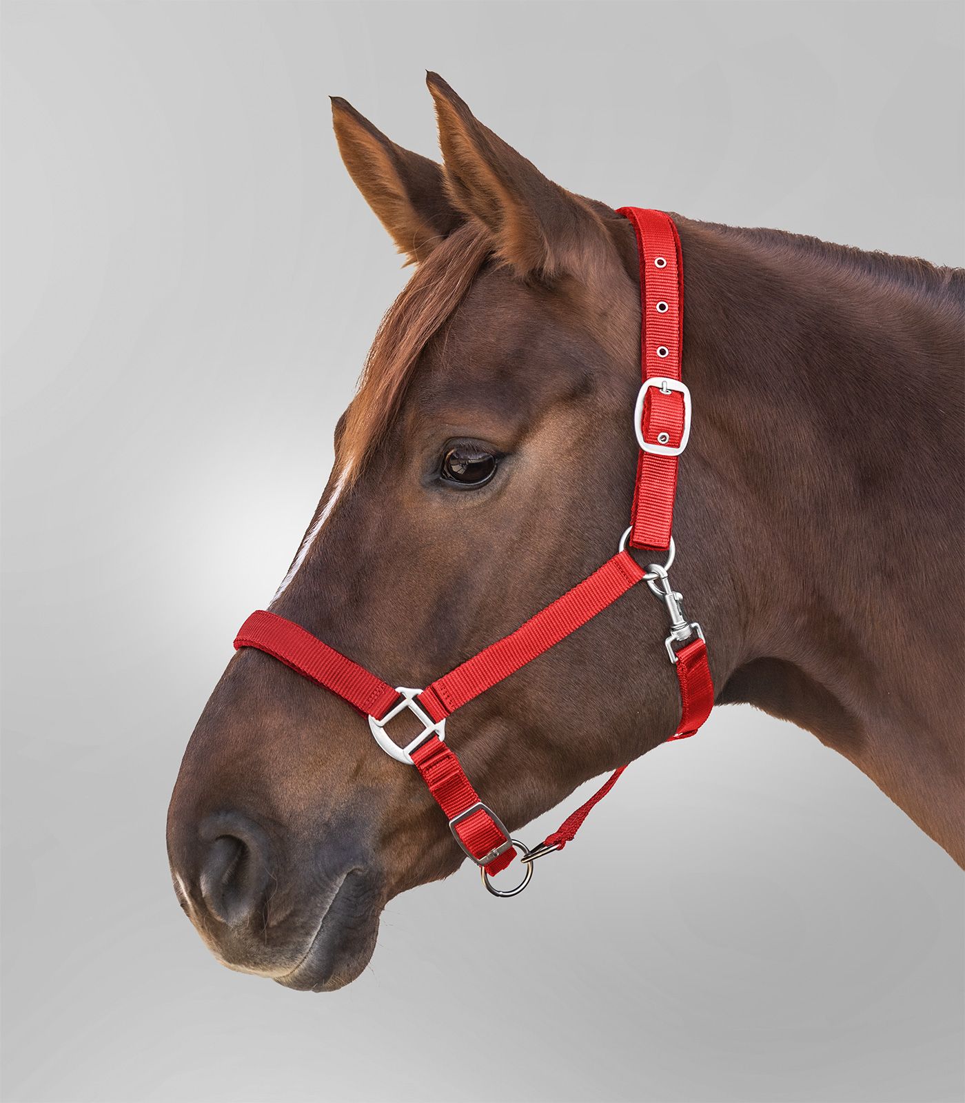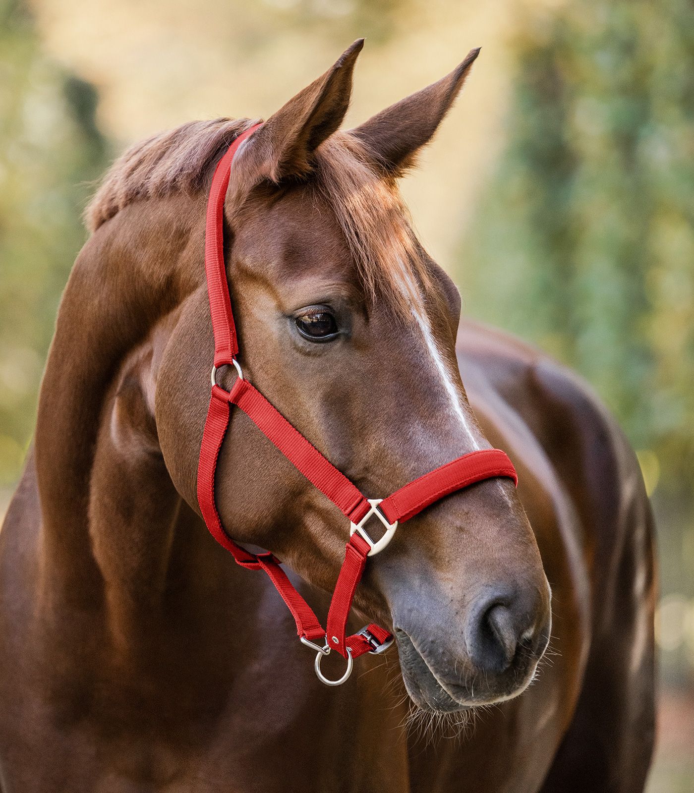Kiva punainen riimu, jossa pehmeästi vuorattu turpa- ja niskaosa.