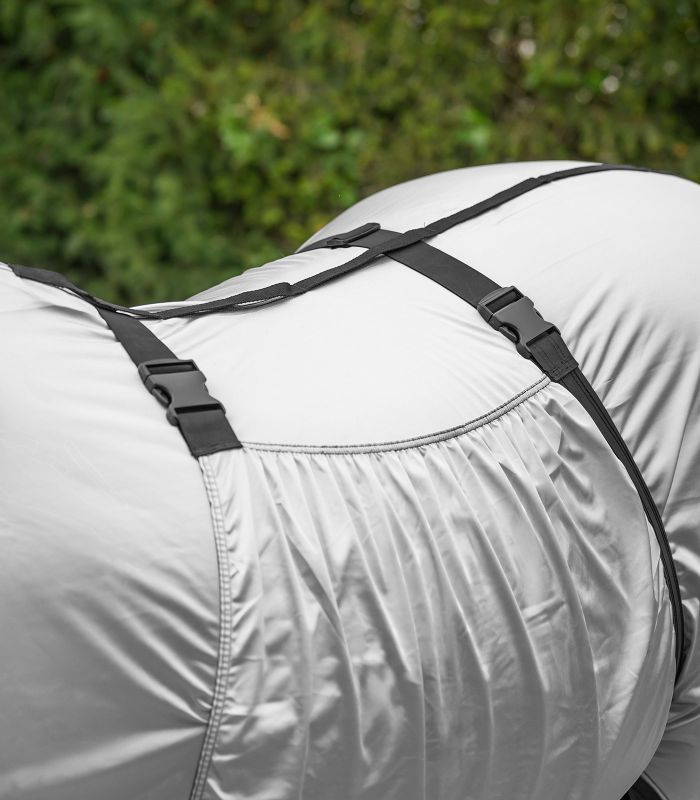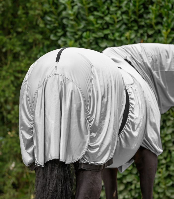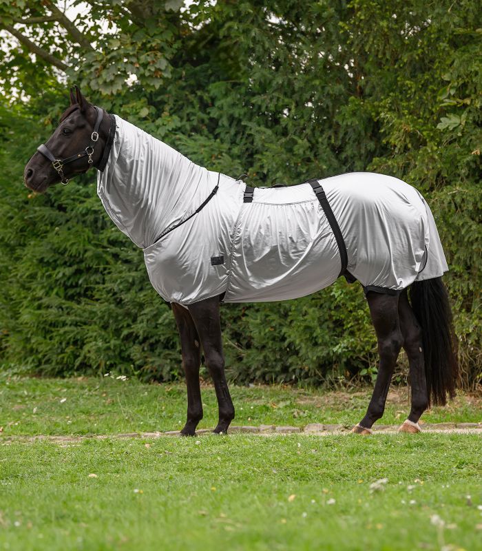 Kattava suoja hevosille, joilla on kesäihottuma, valmistettu erityisestä, hengittävästä toiminnallisesta materiaalista. Tuotteessa on kiinteästi integroitu kaulaosa ja leveä vatsaläppä.